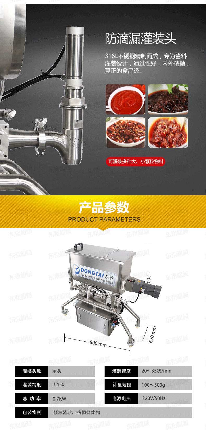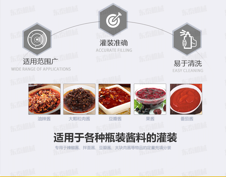 4、顆粒醬定量灌裝機主要針對食品行業(yè)的醬類分裝設(shè)計生產(chǎn),香菇醬灌裝機特別適用于調(diào)味品中帶顆粒并且濃度較大的辣椒醬、豆瓣醬、花生醬、芝麻醬、果醬、牛油火鍋底料、紅油火鍋底料等物質(zhì)的粘稠醬類的灌裝;
