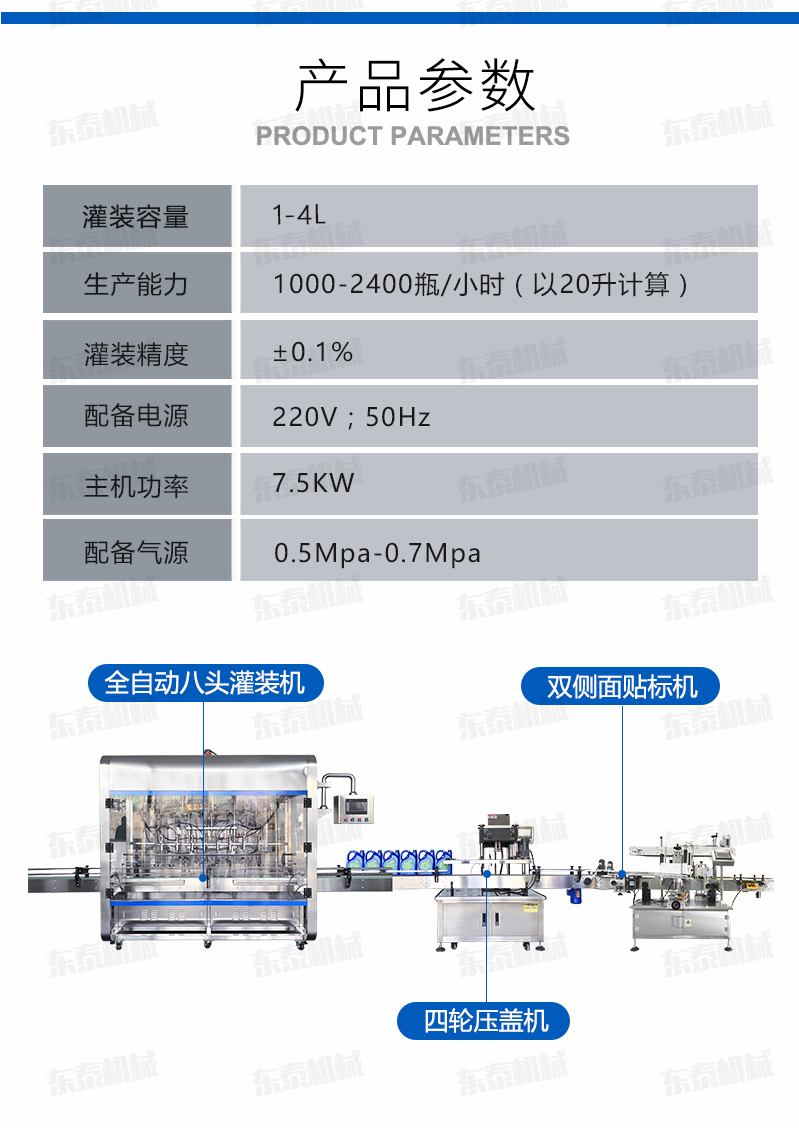 • 18升潤滑油灌裝生產線簡介: 18升潤滑油灌裝生產線采用流量計的灌裝方式,一對一系統設計,一對一系統設計,每套系統都可單獨使用不受影響,設備可完成不同瓶型的自動定量;灌裝頭自帶...