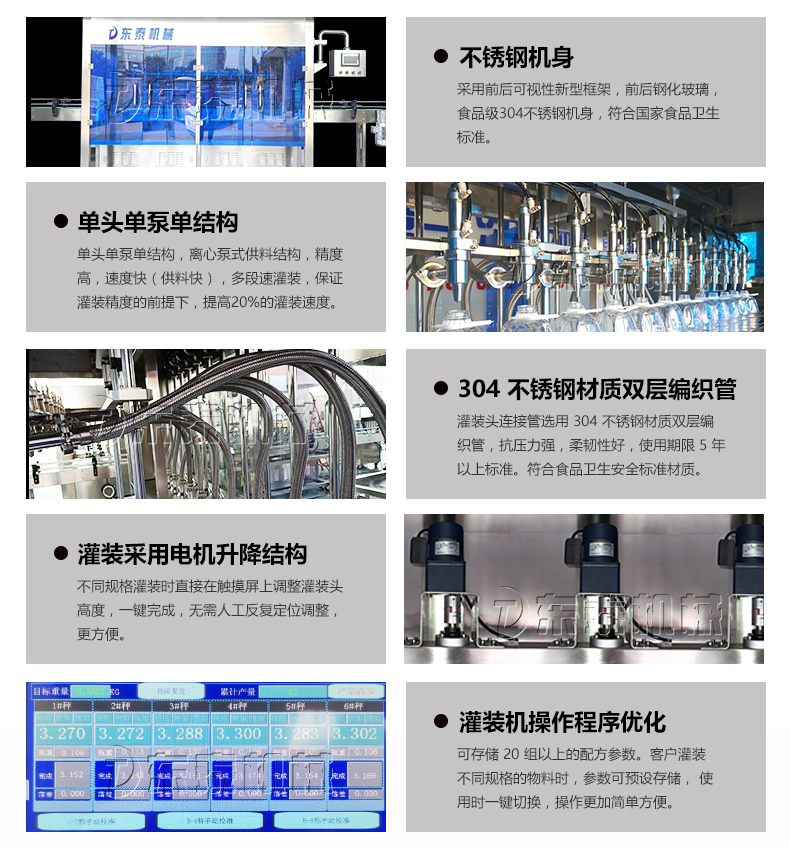 驅動方式更是通過伺服電機配合滾珠絲杠帶動相應料缸內的活塞做往復運動,從而讓料缸前腔產生負壓,以電機脈沖控制電機旋轉并控制活塞行程,從而調節灌裝量。驅動的方式應用于容積柱塞式灌裝方式,這種灌裝方式和物料接觸部分均為不銹鋼316L 材質,灌裝過程中無污染,各物料轉換清洗方便,車間灌裝結束設備維護清洗便捷,大大優于自流其他灌裝方式。氣缸驅動相比伺服驅動針對灌裝的計量范圍更加廣泛靈活,針對客戶多種灌裝規格的需求服驅動方式調整方便,僅需在觸摸屏上設置即可,一般出廠可以根據客戶常用規格直接寫入程序。伺服驅動方式灌裝速度快,不受氣壓的影響,灌裝速度可控??傊核欧寗臃绞皆诓僮魇褂谩⒕日`差、整機調整、設備清洗、維護保養等方面更加方便客戶使用。并且我們公司有著優質的售后服務團隊為您以后的使用保駕護航。
