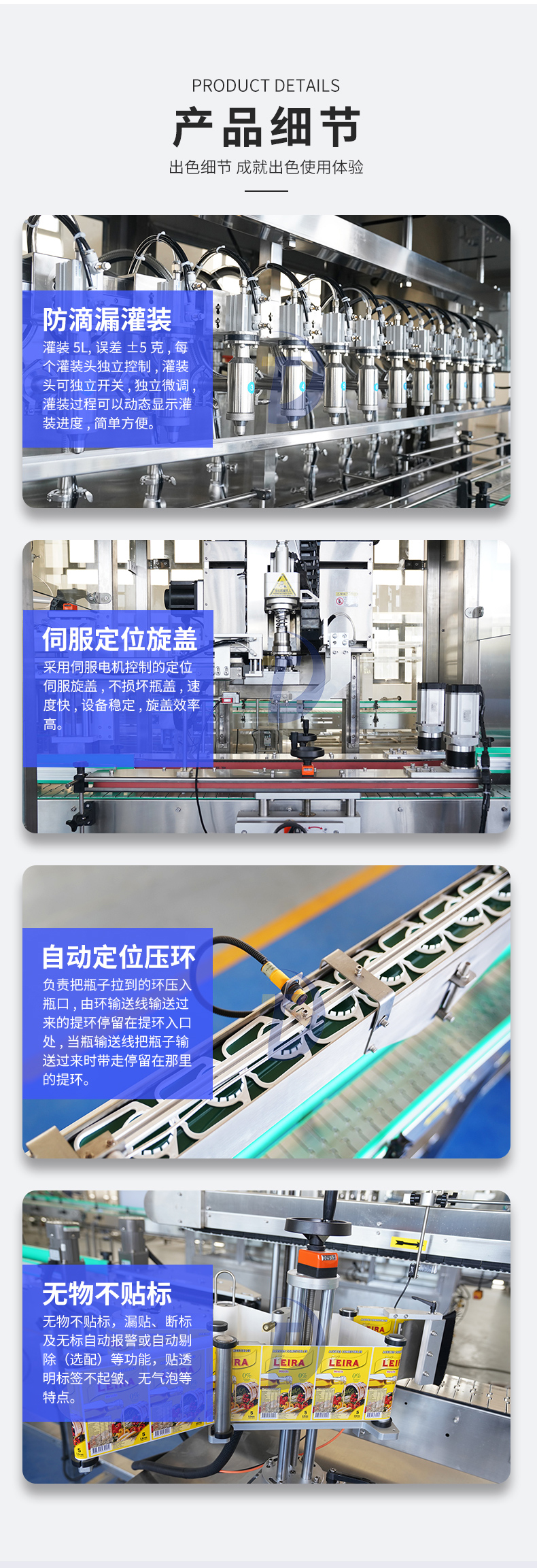 全自動食用油灌裝機需要根據不同容器的規格和油的流量進行參數設置。首先,我們需要設置油的量,可以是固定的或根據容器容量進行自動調整。接著,需要設置灌裝速度和灌裝口的高度等參數。在這個過程中,需要通過灌裝頭上的傳感器來檢測是否有油流出。如果有油流出的話,就需要回收和再利用。