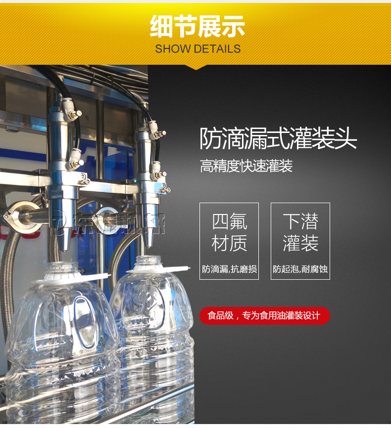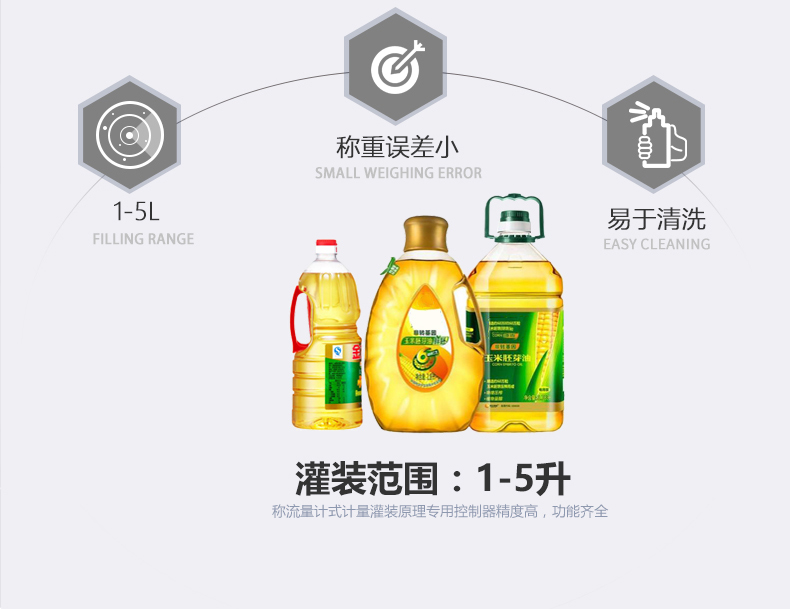 該系列食用油灌裝機采用流量計式計量灌裝原理,多項技術認證,適用于各種規格(1-5 升)的南瓜籽油、榛子油、牡丹籽油、芝麻油、核桃油、山茶油、亞麻籽油、棉籽油、橄欖油、大豆油、玉米油、菜籽油等食用油灌裝。設備采用高精度的旋轉編碼器計量,保證了 1‰的灌裝精度,在保證灌裝精度的同時,提高了20%-35%的灌裝速度,操作簡單,維護方便,節省人工成本,生產效率更高。